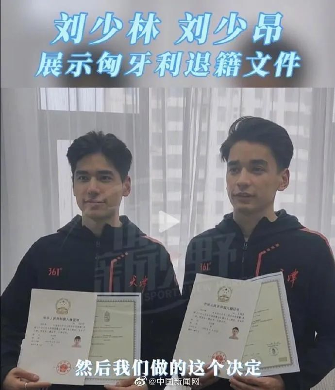 张仲权在视频中展示了刘少林和刘少昂的《中华人民共和国入籍证书》。他表示,去年12月,中国国家移民局已经同意刘少林和刘少昂加入中国国籍。“匈牙利政府于今年3月初正式回函,确认他们注销了匈牙利国籍。在这基础上,他们拿着注销证明,去天津正式办理国籍和户籍。”