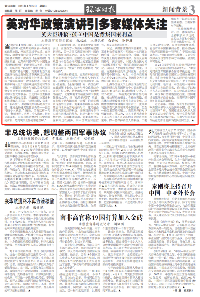 《金融时报》称,克莱弗利发表这番讲话,正值西方一方面对中国的崛起感到担忧,另一方面又需要维持同中国的合作和经济联系之际。在本月对中国进行国事访问期间,法国总统马克龙建议欧盟与中美在台湾问题上的紧张关系保持距离。美国财政部长耶伦上周表示,任何与中国“脱钩”的努力都将是“灾难性的”。