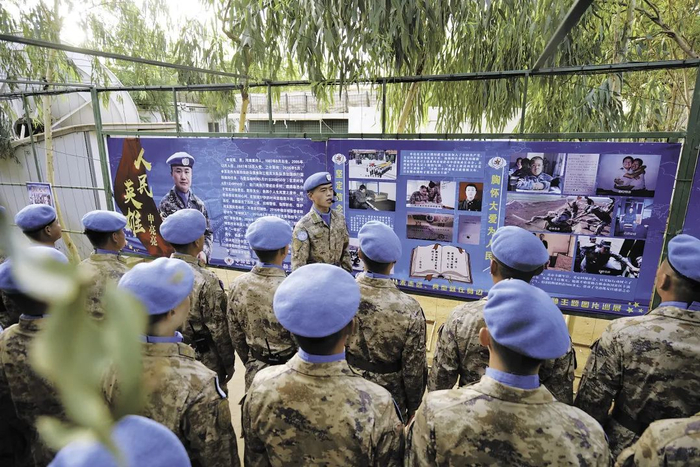 中国第10批赴马里维和部队日前举行纪念“人民英雄”申亮亮系列活动,缅怀为捍卫和平英勇献身的烈士。图为官兵们在参观主题图片巡展。葛学禹 摄