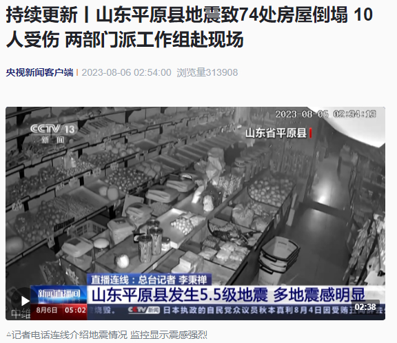 8月6日2时54分:山东德州市平原县发生5.5级地震 震源深度10千米
