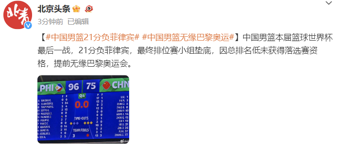 中国男篮本届篮球世界杯最后一战,21分负菲律宾,最终排位赛小组垫底,因总排名低未获得落选赛资格,提前无缘巴黎奥运会。