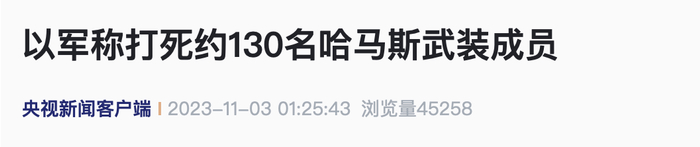 当地时间11月2日晚,以色列国防军发言人表示,当前以色列国防军正继续在加沙地带与巴勒斯坦伊斯兰抵抗运动(哈马斯)武装人员展开激烈交火。在交火中,以军打死约130名哈马斯武装成员。