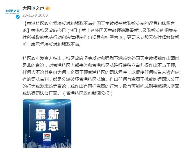 香港特区政府今日(9日)就十名外国天主教领袖联署就涉及黎智英的相关案件所采取的执法行动和法律程序作出误导和抹黑言论,更要求立即无条件释放黎智英,表示坚决反对和强烈不满。