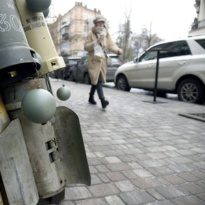 当地时间2023年12月19日,乌克兰基辅街头摆放弹壳制成的“圣诞树”,警示俄乌冲突仍在持续。(视觉中国)