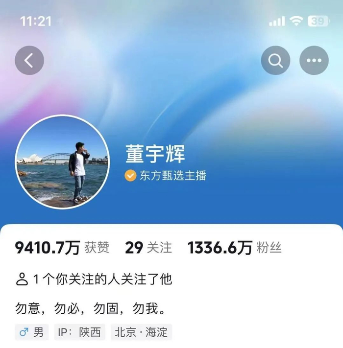 此前,董宇辉抖音账号认证为“东方甄选主播”,签名为“勿意,勿必,勿固,勿我”。更早之前,董宇辉账号的签名则为“曾经是老师,现在是售货员”。