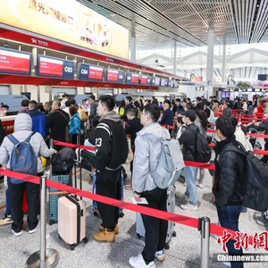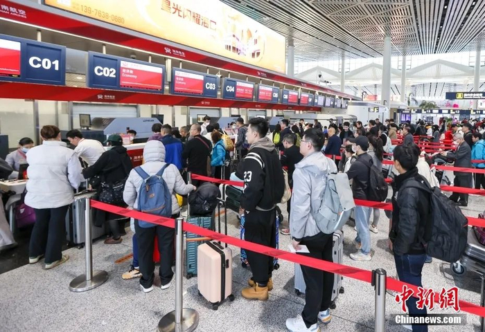 2月8日,海南海口,旅客在海口美兰国际机场T2航站楼排队办理值机。春节临近,海口美兰国际机场客流攀升。中新社记者 骆云飞 摄