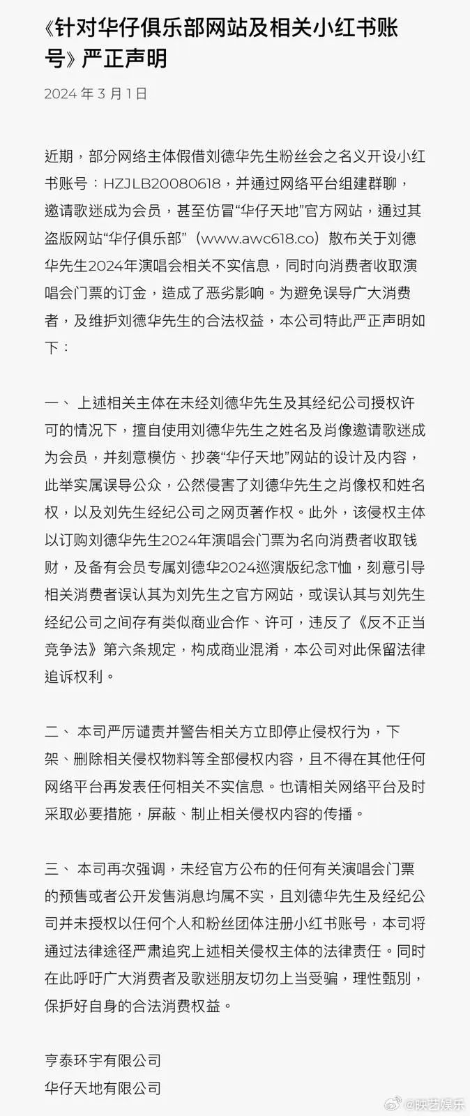 3月1日晚间,刘德华电影公司@映艺娱乐 发布声明:近期,部分网络主体假借刘德华先生粉丝会之名义开设小红书账号:HZJLB20080618,并通过网络平台组建群聊,邀请歌迷成为会员,甚至仿冒“华仔天地”官方网站,通过其盗版网站“华仔俱乐部”(www.awc618.co)散布关于刘德华先生2024年演唱会相关不实信息,同时向消费者收取演唱会门票的订金,造成了恶劣影响。为避免误导广大消费者,及维护刘德华先生的合法权益,本公司特此严正声明如下↓