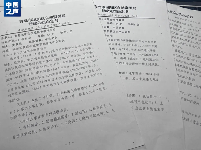 青岛市行政处罚与行政强制信息公示平台显示,2023年11月、12月,城阳区自然资源局向太平陵公墓运营方青岛太平山公益服务有限公司,开出3份罚单共计罚款900多万元。其中一份罚单明确其涉嫌违法使用林地建设墓地,两份罚单涉及非法圈占华阴社区集体土地建太平陵公墓。实际上,在2017年,太平山公司因非法占用土地已被罚85万多元。