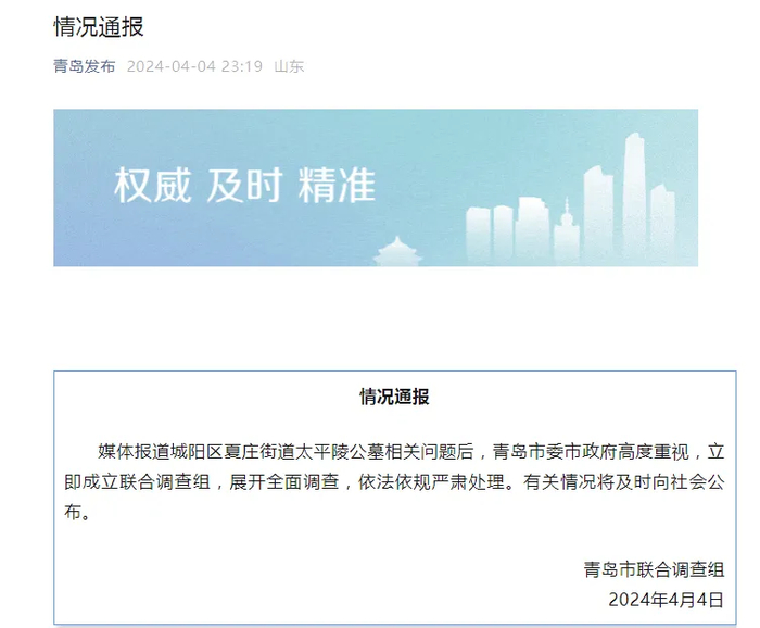 媒体报道城阳区夏庄街道太平陵公墓相关问题后,青岛市委市政府高度重视,立即成立联合调查组,展开全面调查,依法依规严肃处理。有关情况将及时向社会公布。
