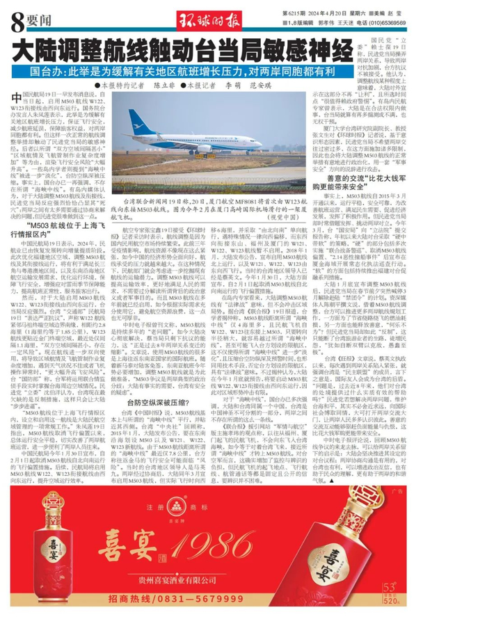航空专家张宝鑫19日接受《环球时报》记者采访时表示,航线调整是因为国内民用航空市场持续繁荣。此前三年受疫情影响,航线资源不像现在这么紧张,如今中国的经济形势全面向好,航线承受的压力就越来越大。在这种情况下,民航部门就会考虑进一步挖掘现有航线的运输潜力。调整M503航线可以提高运输效率,更好地满足人民的需求,不需要过分解读所谓背后的政治意义或者军事目的。而且M503航线在多年前就已经启用,如今根据实际需求充分使用它,避免航空资源浪费,这一点也无可厚非。
