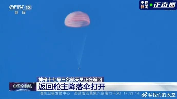 神十七三名航天员正在返回,返回舱主降落伞打开