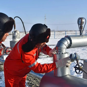 11月24日,新疆油田吉庆油田作业区两名工作人员正在观察生产井压力,保障页岩油平稳生产。新华社记者 顾煜 摄