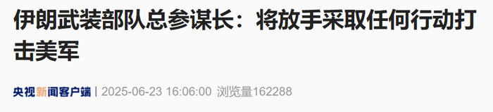 当地时间23日,伊朗武装部队总参谋长穆萨维表示,由于美国公然直接参战,侵犯了伊朗的主权,伊朗武装力量将会放手采取任何行动打击美国在中东地区的利益和美军,决不退缩。