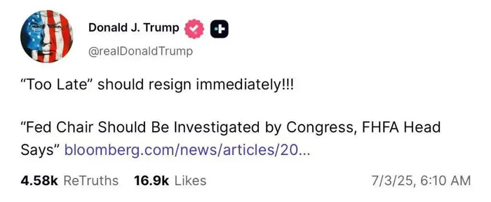 特朗普2日在社交媒体上转发关于鲍威尔应被调查的文章,并点评称“‘太迟(先生)’应该立即辞职!!!”