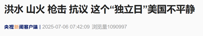7月4日是美国的“独立日”。得州自4日晚暴雨引发的洪灾死亡人数还在不断上升;已经蔓延3天的山火目前也仅10%得到控制;独立日当天发生庆祝性鸣枪事件,随后又发生多起枪击,已致20余人死伤;数十万人参与的街头示威也仍在进行中。