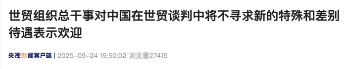 当地时间23日,中方在第80届联合国大会相关活动上宣布,中国作为负责任的发展中大国,在世贸组织当前和未来谈判中将不寻求新的特殊和差别待遇。