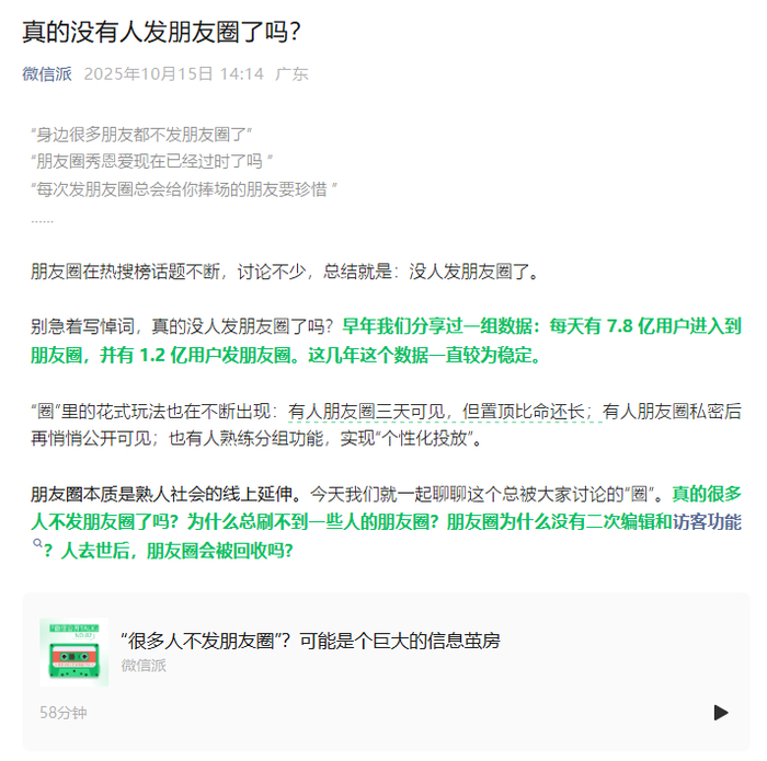 10月15日,“微信派”微信公众号发布文章《真的没有人发朋友圈了吗?》,回应朋友圈设置的相关话题。