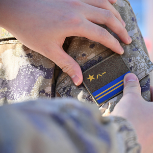 军旗臂章上半部保持解放军军旗旗面基本式样,下半部为深空蓝镶嵌金黄色条,象征进军浩瀚太空。