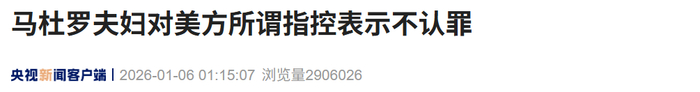 当地时间1月5日,遭美国强行控制的委内瑞拉总统马杜罗及其妻子弗洛雷斯在纽约南区联邦地区法院首次出庭时,对美方的所谓“指控”表示“不认罪”。