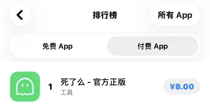 1月8日,苹果应用商店一款名为“死了么”的App受到关注。截至发稿时,该款App在苹果付费软件排行榜位列第一。