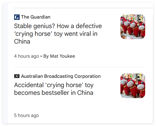 不过,西方媒体对于“哭哭马”的关注算是“后知后觉”了。在10多天前这款玩偶刚火起来的时候,一些与中国互动更紧密的亚洲国家的媒体,就已经介绍过一轮“哭哭马”的“事迹”了。