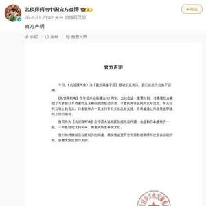 据@名侦探柯南中国官方微博 消息,1月31日晚,《名侦探柯南》中国大陆地区版权总代理上海新创华文化发展有限公司发布官方声明: