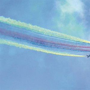 11时许,在现场观众热切期待下,六架喷涂中国国旗与八一军徽的歼-10表演机出现在海面上空,随着六机超密集编队低空通场,海天之间留下的红、黄、蓝三色彩烟将天空点缀得格外绚烂。