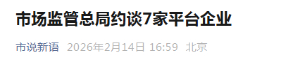 2月13日,市场监管总局约谈阿里巴巴、抖音、百度、腾讯、京东、美团、淘宝闪购等平台企业,要求有关平台企业严格遵守《中华人民共和国反不正当竞争法》《中华人民共和国价格法》《中华人民共和国消费者权益保护法》《中华人民共和国电子商务法》等法律法规规定,主动落实主体责任,进一步规范平台促销推广行为。提醒相关平台企业要杜绝各种形式的“内卷式”竞争,共同维护公平竞争市场环境,促进平台经济创新和健康发展。