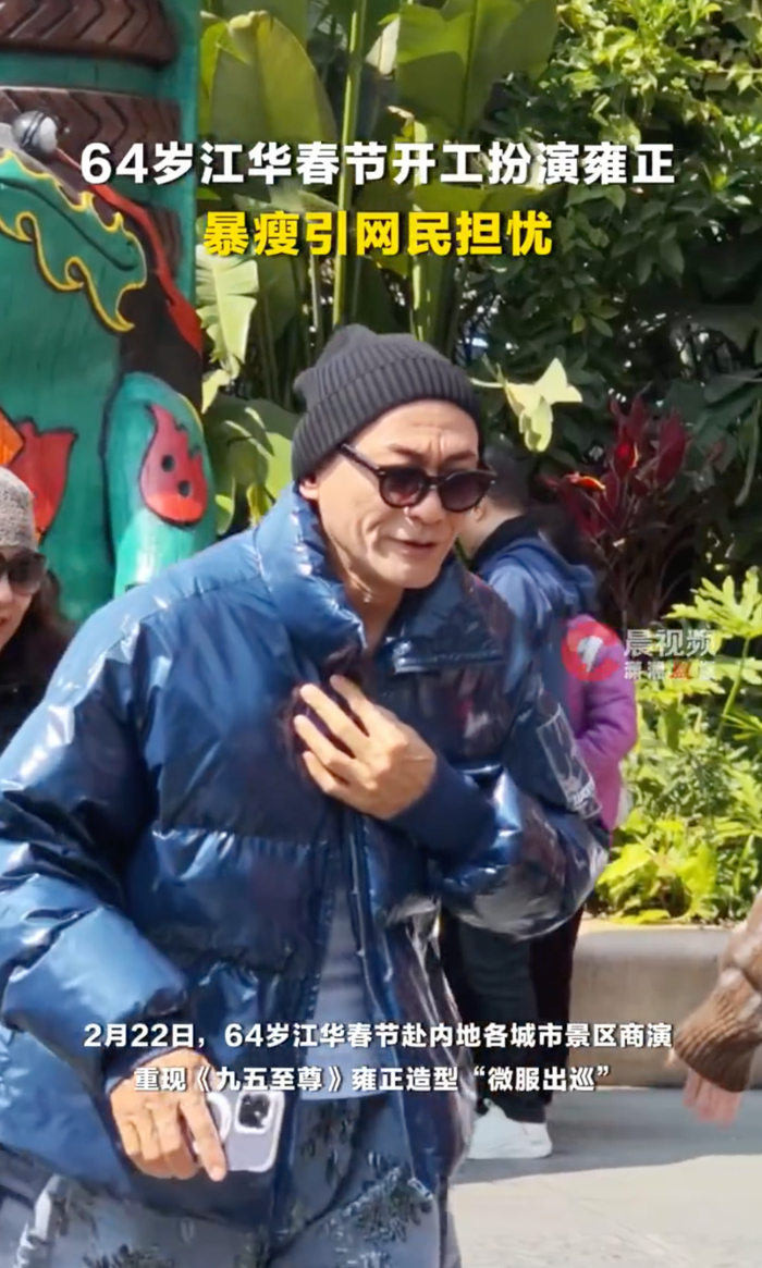 春节假期,64岁香港演员江华赴内地各城市景区商演,重现《九五至尊》雍正造型“微服出巡”。网友发现他暴瘦脸颊凹陷,颈纹明显,担忧健康状况,“老了还是不能太瘦”“变成纸片人”。