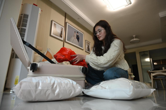 出发前,黄歆在巴马的婚房内将家乡的“味道”尽可能多地塞进齐腰高的行李箱。