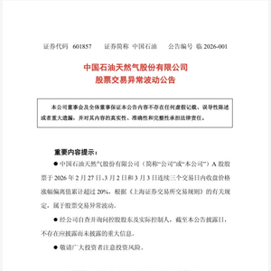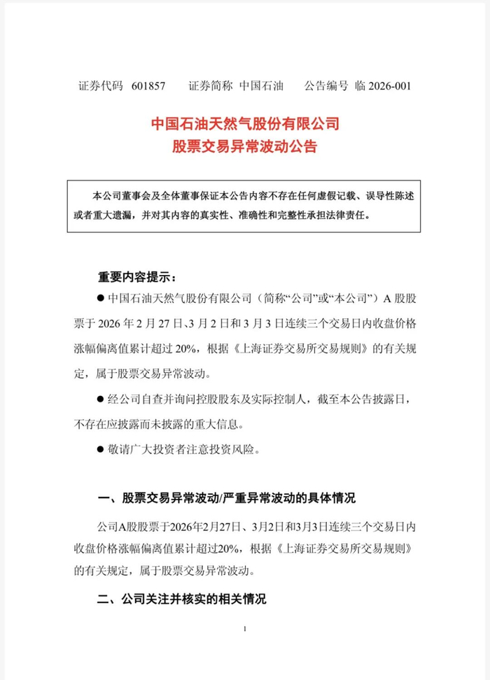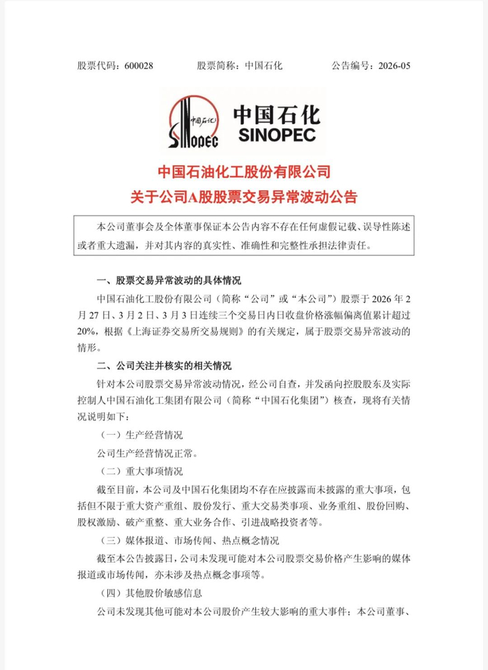3日晚间,中国石化、中国海油、中国石油接连发布股票交易异常波动公告,称公司股票于2月27日、3月2日、3月3日连续三个交易日内日收盘价格涨幅偏离值累计超过20%,属于股票交易异常波动情形。