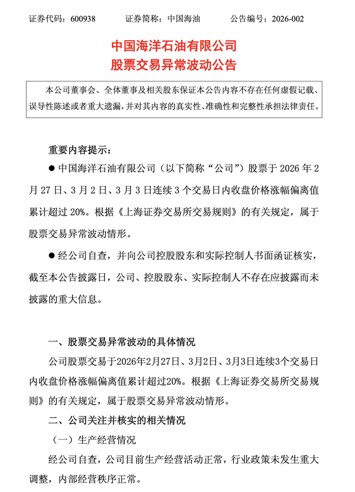 中国海油发布公告称,股票交易于2026年2月27日、3月2日、3月3日连续3个交易日内收盘价格涨幅偏离值累计超过20%。根据《上海证券交易所交易规则》的有关规定,属于股票交易异常波动情形。