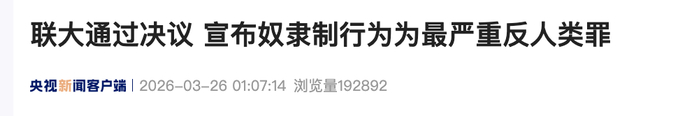 当地时间3月25日,第80届联合国大会举行会议,纪念“奴隶制和跨大西洋贩卖奴隶行为受害者国际日”,并通过一项决议,将贩运被奴役的非洲裔及对非洲裔的种族化奴役行为宣布为最严重的反人类罪。