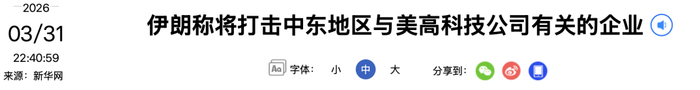 伊朗伊斯兰革命卫队3月31日发布公告称,将中东地区与18家美国信息通信技术和人工智能企业有关的公司机构作为打击目标,包括惠普、苹果、谷歌、特斯拉、微软等公司。