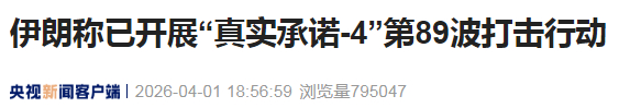 当地时间4月1日下午,伊朗伊斯兰革命卫队发布声明,在“真实承诺-4”第89波行动中,伊朗武装力量与“抵抗阵线”协同作战,对地区内美国和以色列目标实施打击。