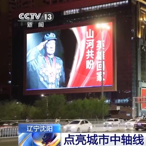 为迎接第十三批12位在韩中国人民志愿军烈士遗骸归来,辽宁沈阳市青年大街主干线全线点亮,户外大屏致敬标语和3500面国旗一起,以中国红主色调迎接英雄回家。