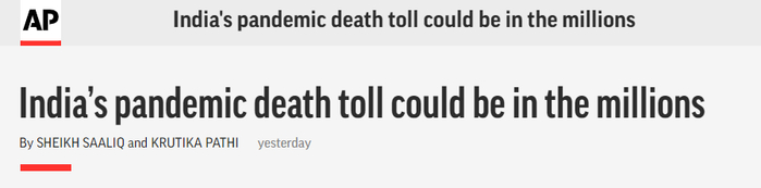 据美联社消息,报告由印度政府前首席经济顾问苏布拉马尼亚姆(Arvind Subramanian)以及美国智库“全球发展中心”和哈佛大学的另外两名研究人员发表,其中,研究人员研究了印度各种原因造成的死亡数据,并与前几年的死亡率进行了比较(这种方法被广泛认为较为准确),得出上述结论。