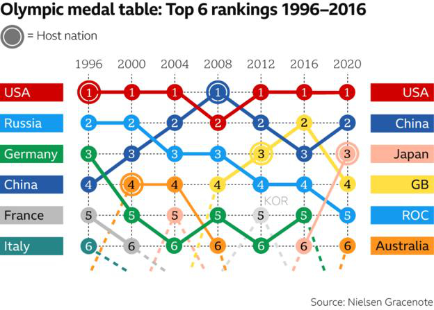 美国是奥运史上的传统超级大国,除了2008年北京奥运上中国队借东道国的东风夺下第一,美国队始终位居金牌榜首。另一个已经破落的超级大国苏联/俄罗斯队曾经是千年老二,苏联解体后,这一惯性还维持了10年。之后就每况愈下,但滑落的势头似乎被制止了。在东京奥运上俄罗斯奥委会(因为涉嫌违禁药品被禁用俄罗斯名义,只能用俄罗斯奥委会名义)获得20枚金牌,71枚奖牌。相比之下,2012年的伦敦奥运拿到了20枚金牌,68枚奖牌;2016年的里约奥运上,拿到了19枚金牌,56枚奖牌。应该指出的是,这些年来,奥运项目不断增加,奖牌有点通胀,但以传统项目作为“不变币值”来看,奖牌的含金量还是可比的。俄罗斯队在新生项目中表现平平,那些大多是欧美的名堂。抛开这些因素来看,俄罗斯奖牌的大趋势与国力大趋势是有较好的正相关的。