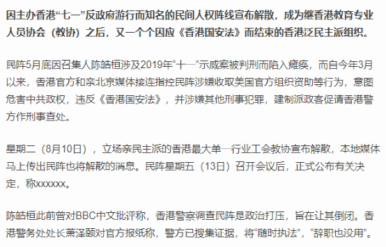 “香港教育专业人员协会(教协)”8月10日宣布解散后,本地媒体传出“民阵”也将解散的消息。该媒体在报道中煞有介事地说,“民阵”星期五(13日)召开会议后,正式公布有关决定,但文中并未给出“民阵”所宣布的具体内容,而是使用“称xxxxxx”代替。