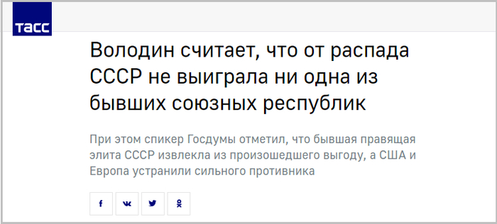 (观察者网讯)当地时间12月8日,俄罗斯国家杜马主席沃洛金发文回忆苏联解体时表示,解体让政治精英们攫取了利益,让美国和欧洲消灭了一个强大的对手,但组成苏联的15个加盟共和国却没有任何一个从中获益,“这对我们所有人来说都是一个悲剧”。