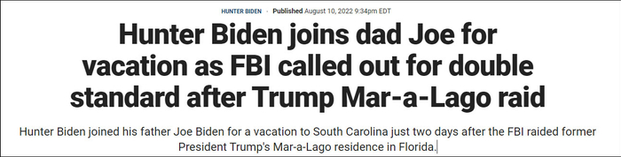 福克斯新闻报道截图:特朗普的海湖庄园被突击搜查,拜登和儿子亨特去度假,FBI双标了