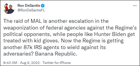 佛罗里达州共和党州长罗恩·德桑蒂斯表示,联邦调查局执行的双重标准显示了一种“香蕉共和国”式的法律体系。他发推文称“对海湖庄园的突袭是对抗政治对手的手段,是联邦调查局被政治武器化的又一次升级,而亨特·拜登却被彬彬有礼地对待”。