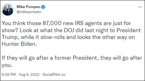 随时“刷存在感”的前国务卿蓬佩奥也发推文声援前总统:“看看司法部都对特朗普总统做了什么,而对亨特·拜登的所作所为却拖延、视而不见。”