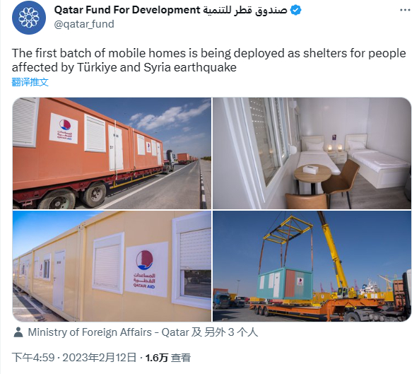 卡塔尔基金会(Qatar Fund For Development)12日发文称,作为赈灾计划的一部分,卡塔尔将为土、叙两国提供集装箱式房屋,为有需要的人提供住处。