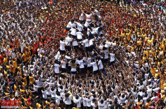 资料图片:在印度孟买,印度教徒庆祝印度教神克里希那诞辰,年轻人搭成一个人体金字塔。