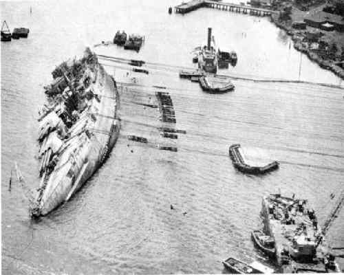 资料图片:二战日军偷袭珍珠港后,美军调动大批力量将倾覆的“俄克拉荷马”号战舰扶正。(图片来源于网络)