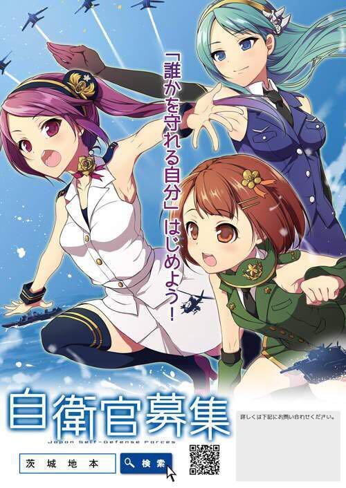 主角岬明乃从小憧憬加入“蓝色人鱼”,于是报考培养“蓝色人鱼”的高中——横须贺海洋女子高校,并登上“晴风”号直接教育舰担任舰长,与舰上三十余名同学和名为“五十六”的一只肥猫一道,展开一段可歌可泣的海(zhu)上(jue)传(guang)奇(huan)之旅……国内曾有弹幕视频网站独家引进这部动画,但在播出2话之后即告下架。据说就是因为下面这张“自卫队征兵海报”引发了有关方面的顾虑: