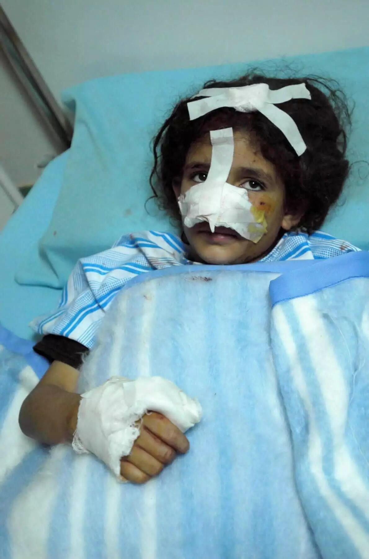 2003年3月24日,一名在美英空袭中受伤的伊拉克女孩在巴格达一家医院接受治疗。(新华社/图)以反恐之名