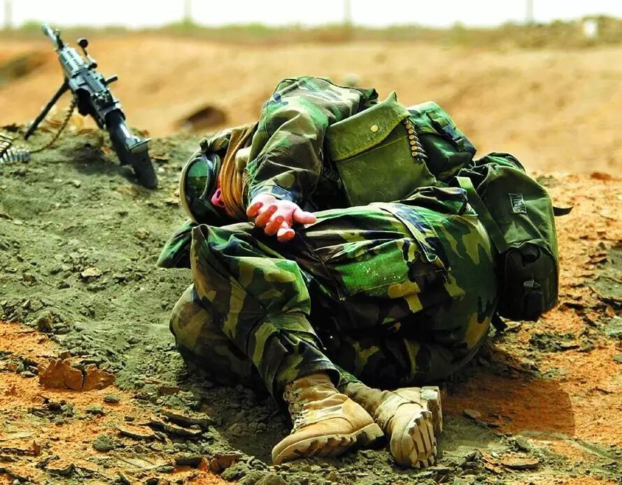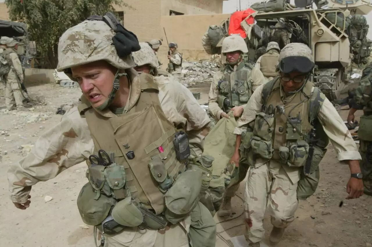 3月23日,在伊拉克南部城市纳西里耶,一名美国海军陆战队士兵站在一名阵亡的美军士兵遗体旁。2002年12月,伊拉克向联合国递交了长达12000页的有关大规模杀伤性武器的报告。即使这厚达一人高的报告,也延缓不了悲剧的发生,小布什政府用大量情报向联合国证明萨达姆是在欺骗国际社会。