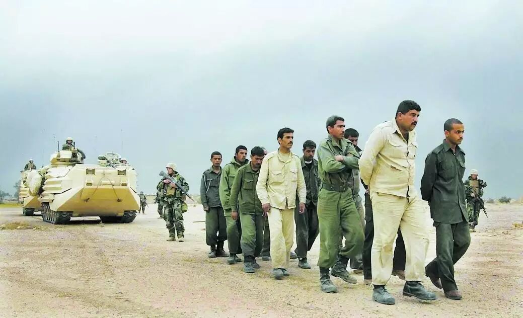 2003年3月23日,美军士兵在伊拉克南部地区押解投降的伊拉克士兵。(新华社/图)